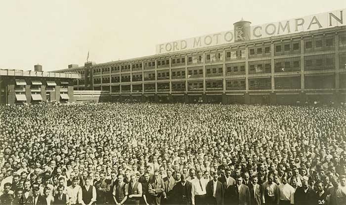 Ford Motor Company с еще живым и здравствующим Генри Фордом внедрила 40-часовую рабочую неделю для заводских рабочих. С выходными по субботам и воскресеньям. Уикенд сначала станет нормой в США, потом в западном мире, теперь — всюду. На фото (4) — собрание 50 тысяч сотрудников Форда в Детройте.
